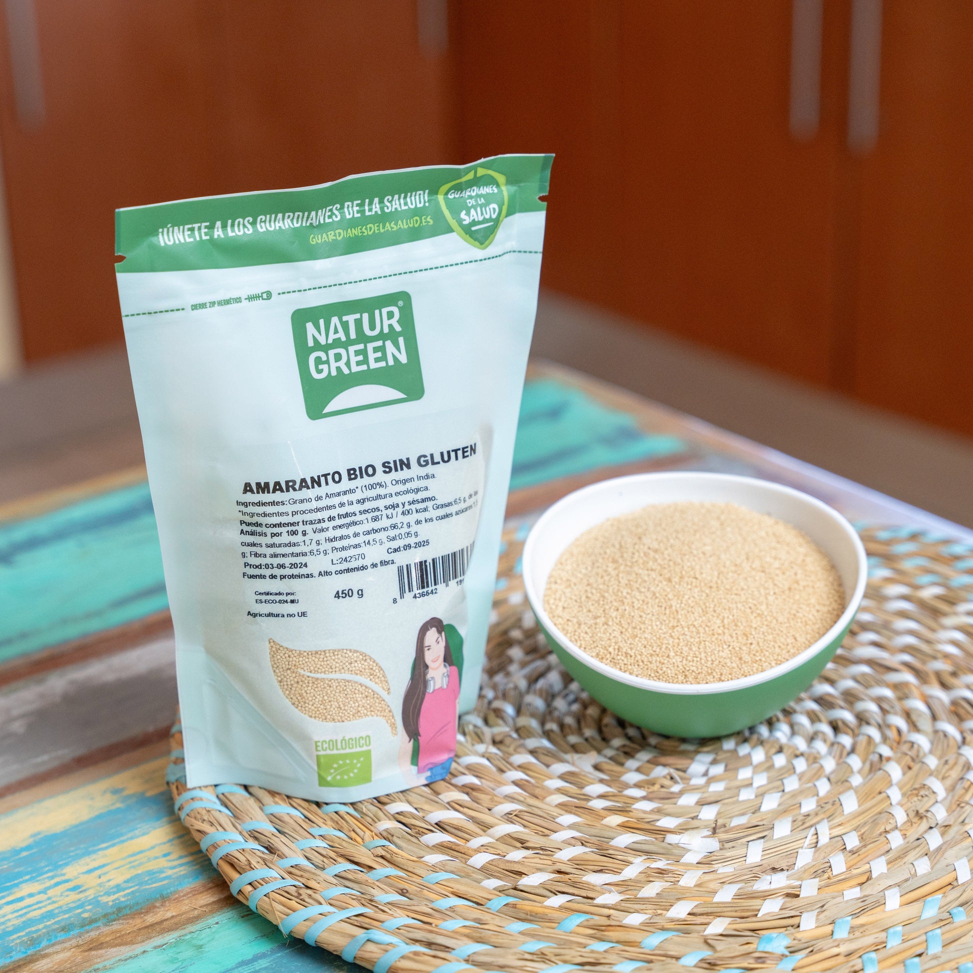 El amaranto ecológico de NaturGreen contiene proteínas, minerales, fibra y vitaminas naturales, y es perfecto para acompañar diferentes bebidas o yogures.